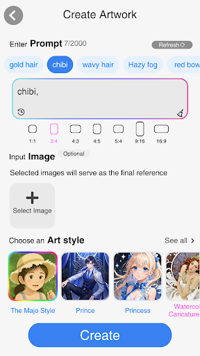 Yes, input descriptive keywords, select an art style, then tap 'Create' to generate artwork based on your prompts.