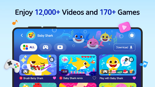 The app features ocean-themed puzzles, educational games, and sing-alongs, including popular Baby Shark songs and dance activities, for fun learning experiences.