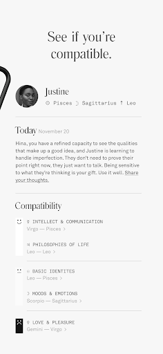 Overall, Co–Star presents a thoughtful, user-centric approach to astrology that balances scientific accuracy with personalized storytelling. Its interface is elegant and approachable, making complex astrological data easy to digest for beginners, yet providing enough depth for seasoned enthusiasts. The most compelling feature is its real-time, individualized horoscopes—delivering daily insights that feel both relevant and insightful.