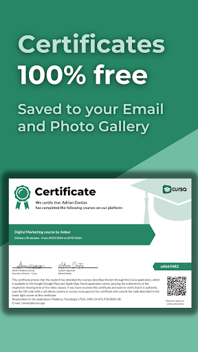 Upon course completion, you receive a digital certificate with a QR code, which is saved in your gallery and can be shared or validated online.
