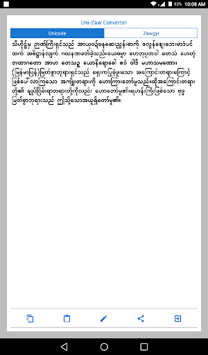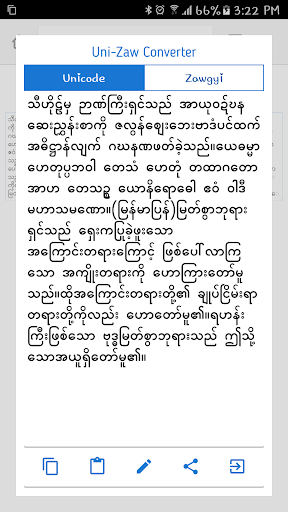 Navigate to Settings > Font Converter, then choose either Unicode or Zawgyi to match your preferred Burmese text standard.