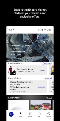 Go to Settings > Rewards or Benefits to view your points, rewards, and redeem GapCash when shopping online or in-store with the app.
