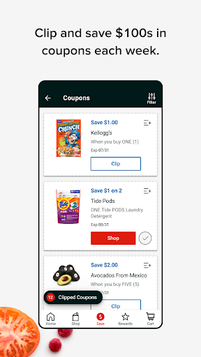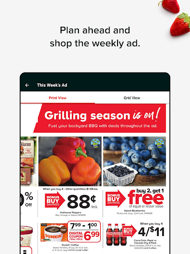 It offers deals browsing, digital Rewards Points, Coupon integration, Deli Order Ahead, and Scan It! for quick checkout.