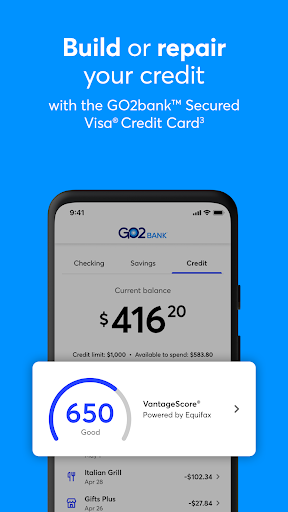 Apply for the GO2bank Secured Visa® Credit Card in the app's Credit feature. It requires no credit check and has no annual fee.