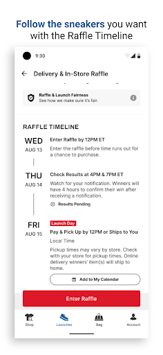 Access the Launch Raffle from the app, select your preferred stores, and enter for a chance to buy hyped sneaker releases through a draw.