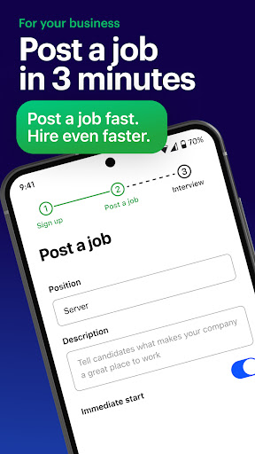 JOB TODAY: Hire & Find Jobs is a streamlined platform designed to connect job hunters with potential employers swiftly and efficiently. Whether you're hunting for your first gig or seeking to advance your career, this app aims to simplify the employment search process by combining user-friendly design with powerful matching tools.
