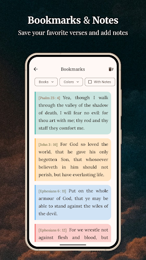 Tap on a verse to add bookmarks or notes. You can also customize colors and organize your highlights through the note-taking menu.