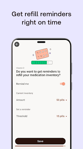 Input your pill quantity in 'Pill Counter,' and the app will automatically send you a refill reminder when supplies run low.