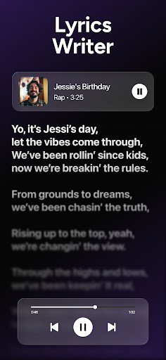 Input your lyrics, choose your preferred style, and the app converts your text into a complete, arranged song automatically.