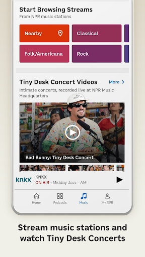 You can find Tiny Desk Concerts in the Music section; just tap the Music tab and select a performance to stream live or on demand.