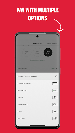 The app supports multiple payment options including cash, credit/debit cards, and Google Pay, accessible during checkout under ‘Payment Options'.