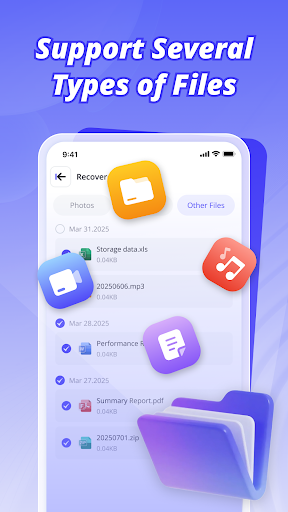 You can recover photos, videos, documents (PDF, DOC), audio files (MP3), ZIP files, and more from internal storage and SD cards.