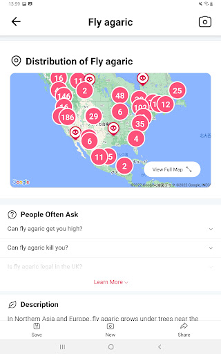 The app offers details like mushroom name, edibility, habitat, identification tips, and toxicity warnings to ensure safe foraging.