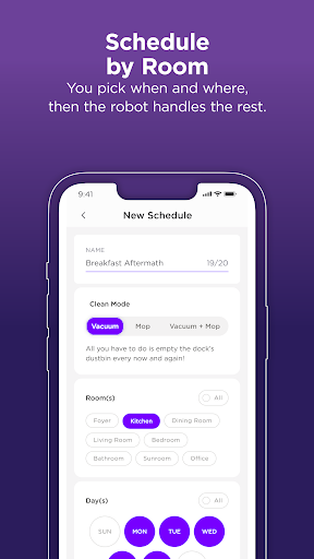 Open the app, go to 'Schedule,' select your desired days and times, and save to automate your cleaning routine.