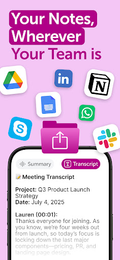 Tap the 'Share' button on any note, then choose the format or platform like Slack, Notion, or Google Docs for easy collaboration.