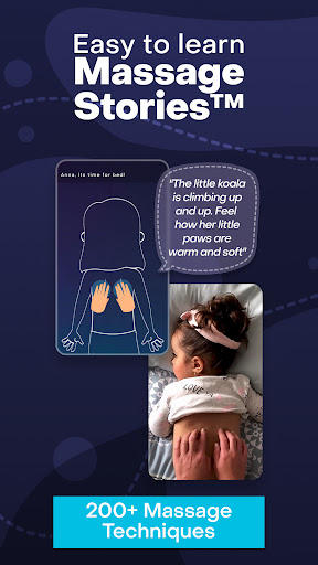 The app offers guided stories, massage techniques, calming sounds, and affirmations designed to promote relaxation and establish healthy bedtime routines.