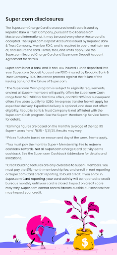 The Super.com Card helps build credit and manage spending. Apply via Settings > Cards, then load funds and use it for qualifying transactions.