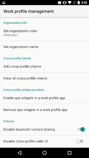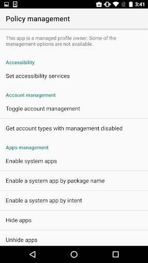 Navigate to Settings > Device policy in Test DPC, then select or customize policies such as app restrictions, security settings, and user profiles.