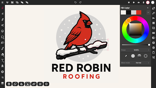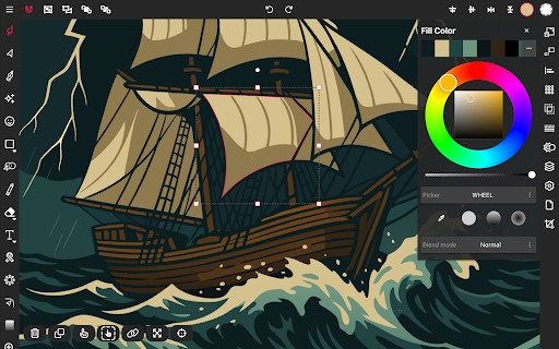 Use the color picker and palette editor to create custom colors, and access the gradient tool for linear or radial gradients via the sidebar.