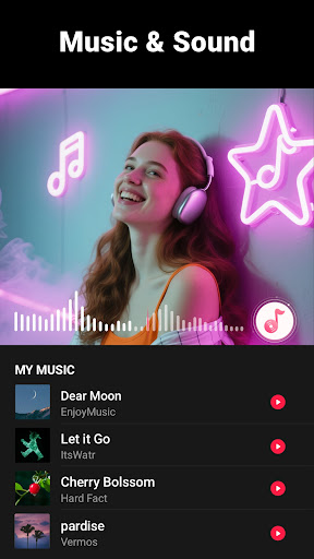 Navigate to the 'Music' section, select from the library or upload your own, then adjust volume and add fade effects. Easily synchronize audio with your video.
