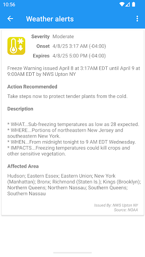 The app delivers severe weather alerts from official sources based on your location or chosen area, accessible via Notifications or in-app warnings.