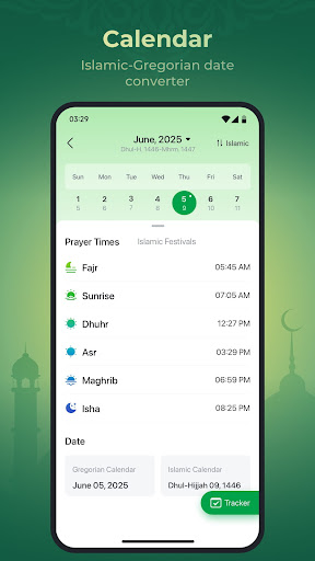 Go to the Hijri Calendar in the main menu to view dates and tap on events to add or view Islamic holidays and prayer schedules.