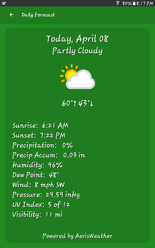 The app sources weather data from AerisWeather, ensuring high accuracy for current conditions and forecasts.