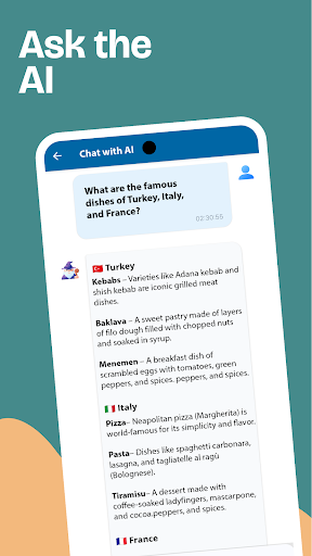 Key features include interactive maps, country info and overviews, flag display, customized country lists, and AI-powered support for questions.