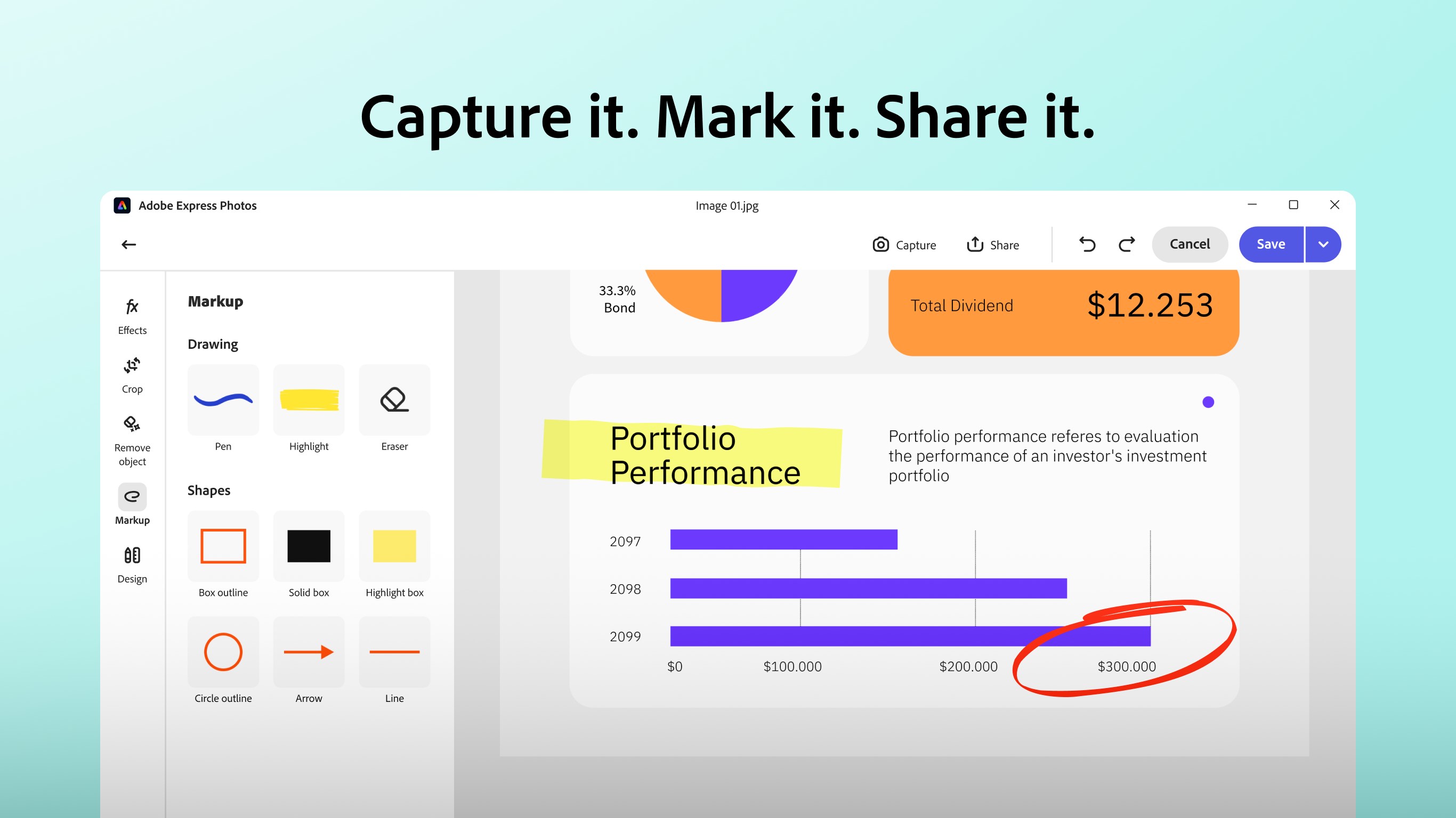 Yes, select the markup tool to add text or insert shapes in any color, which can be easily customized and positioned.