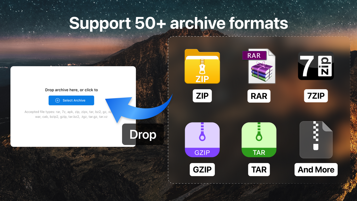AukZip supports over 40 formats including ZIP, RAR, 7Z, TAR, ISO, GZIP, and more. Check the app for the full supported list.
