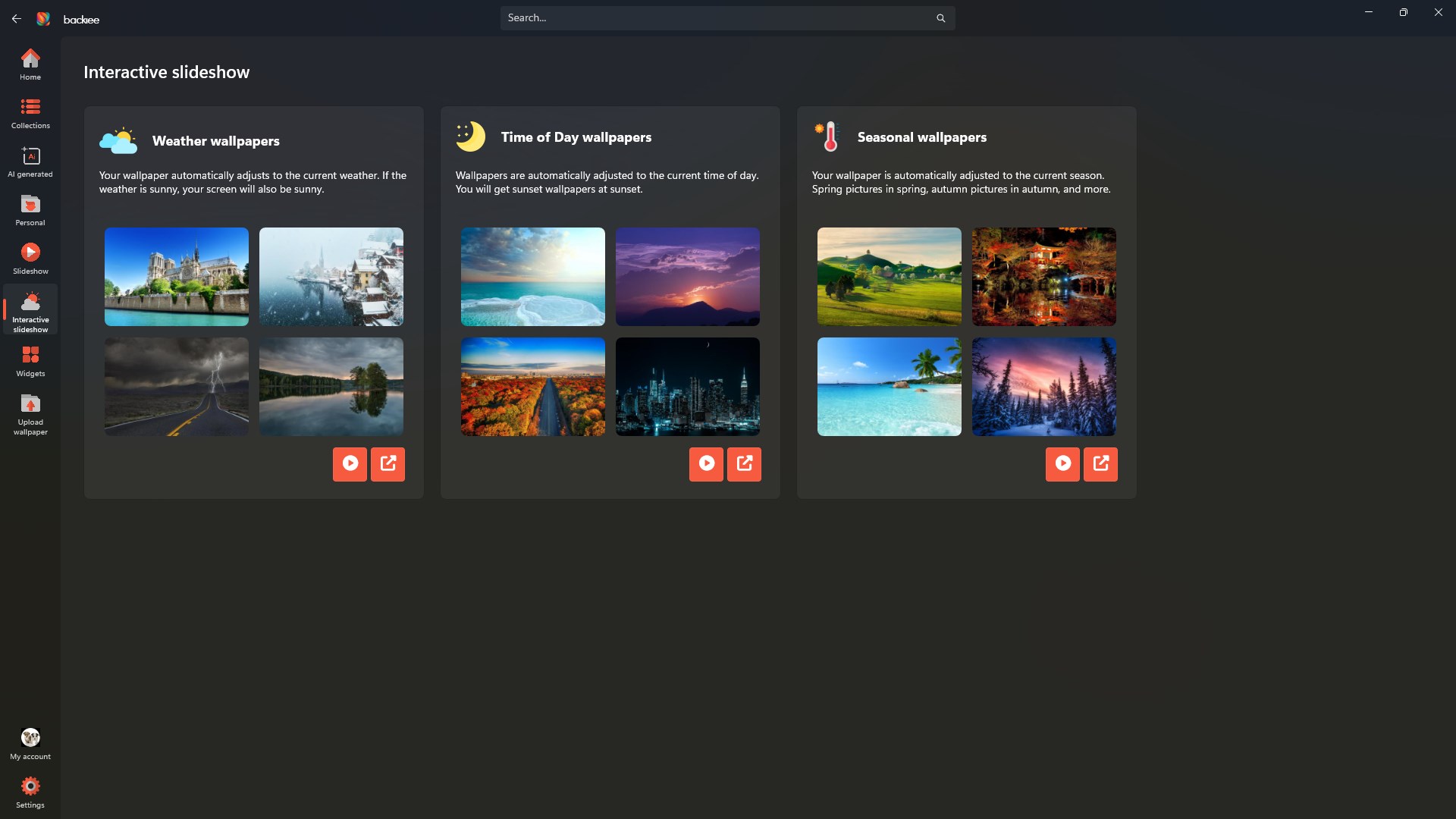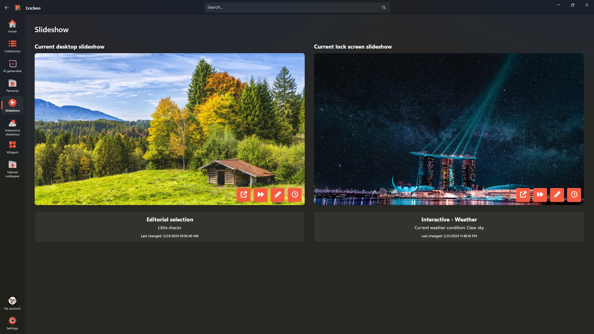 Backiee provides weather and slideshow widgets, accessible via the desktop toolbar, allowing instant info and quick wallpaper control.