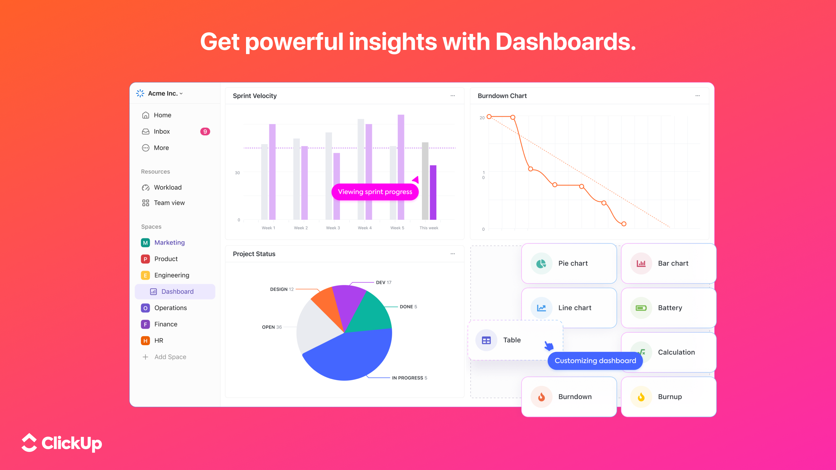 Go to 'Spaces', select a space, then click 'Add View' or 'Customize' to design dashboards tailored to your team's needs.