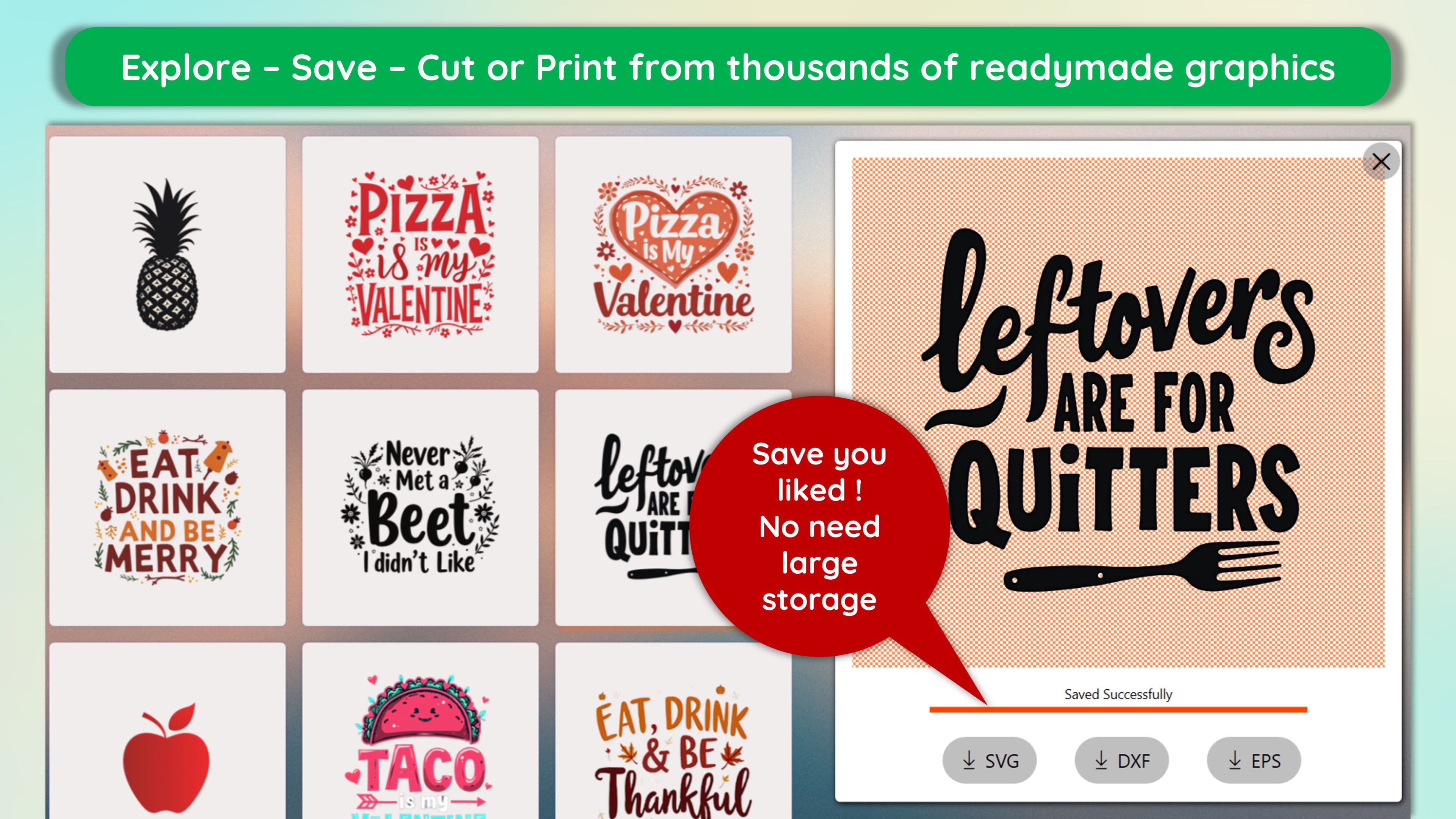Download the app, browse or search for designs, then click 'Download' to save files instantly for import into your cutting software.