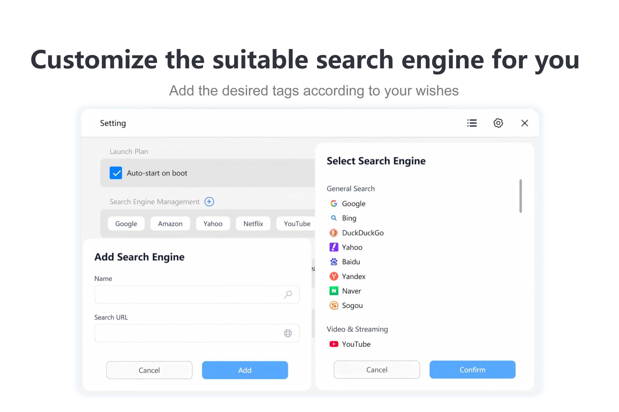 Navigate to Settings > Search Engine, where you can select or add your preferred engines like Bing, DuckDuckGo, TikTok, or Amazon.