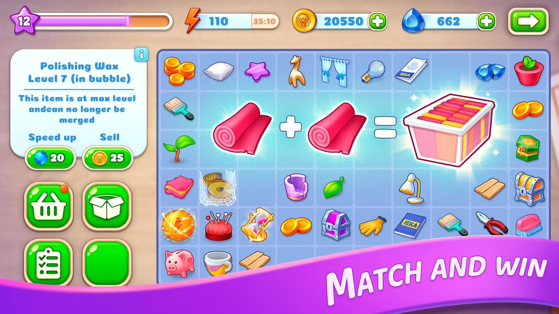 Merging helps create furniture and items efficiently, allowing you to develop unique interior designs and complete decorating challenges.