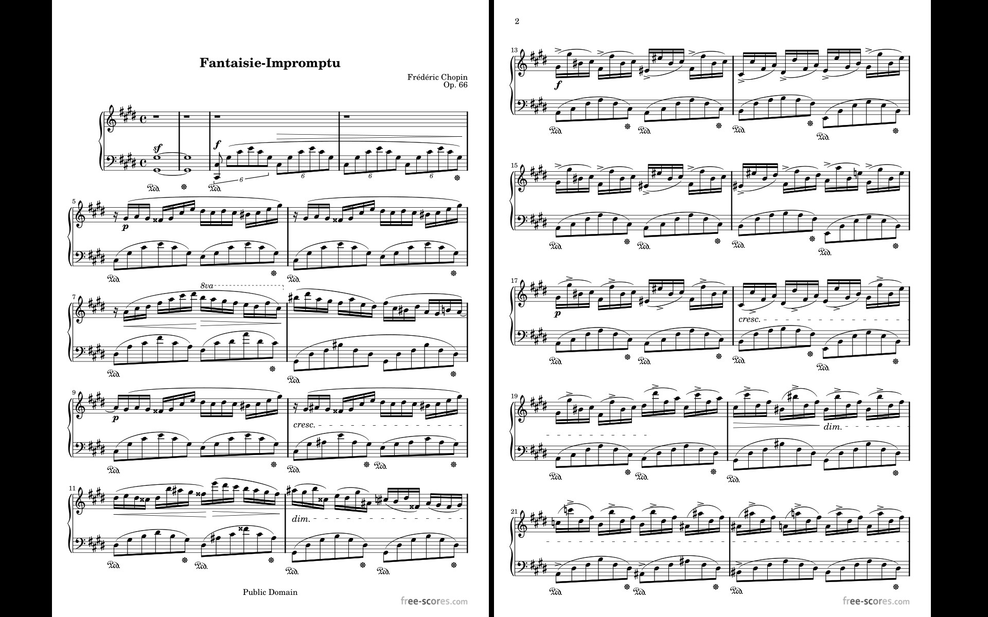 MobileSheets supports two pages side-by-side, half page turns, and vertical scrolling. Adjust these in Settings > Viewing Mode.