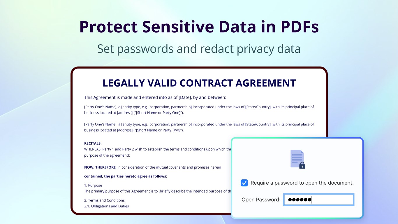 Yes, open the PDF, navigate to the 'Protect' menu, then select 'Password' or 'Watermark' to secure your document.