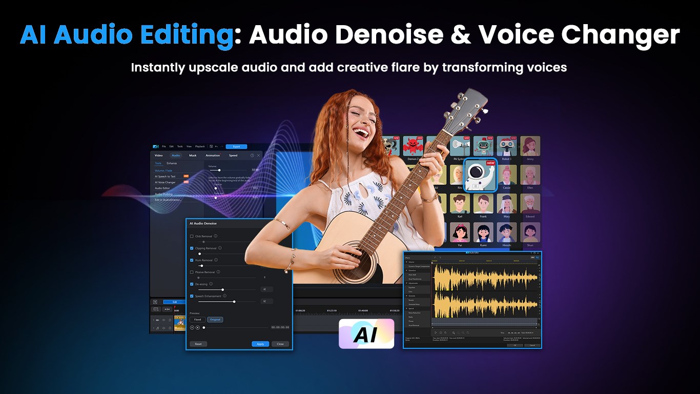 AI tools include background removal, audio denoise, speech-to-text, voice changer, and face blur, accessible via the 'Tools' menu.