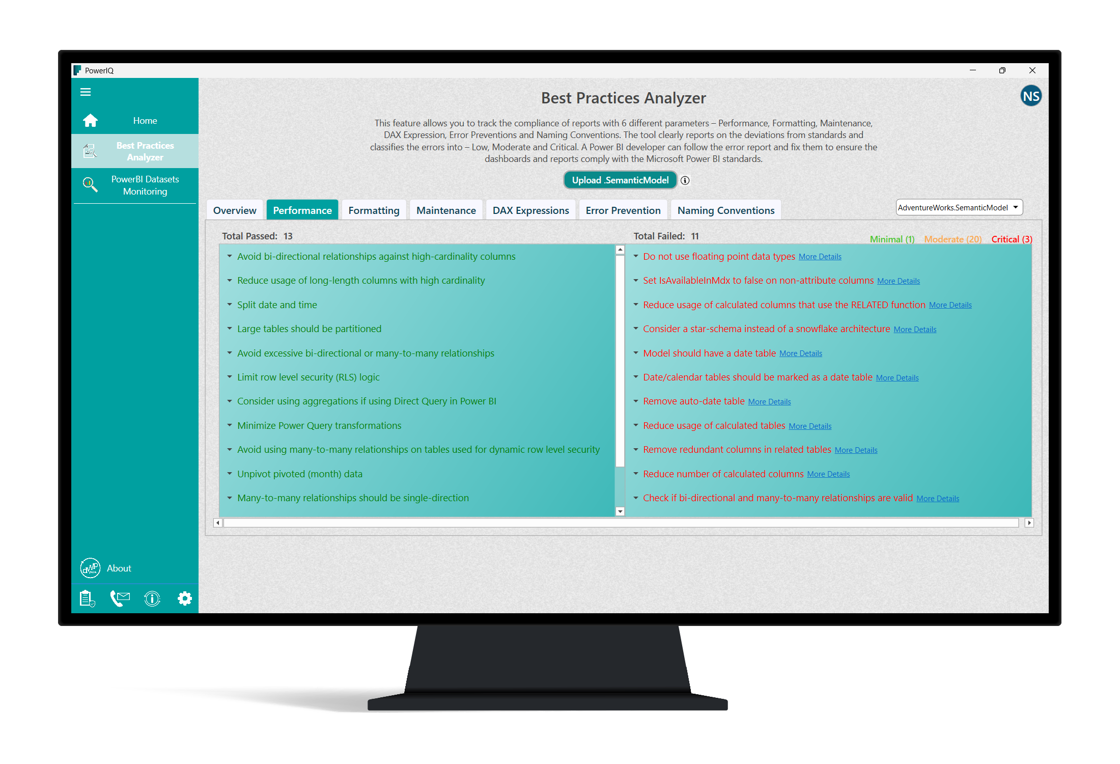 PowerIQ offers performance monitoring and tuning features accessible via Settings > Performance to optimize report loading and data refresh times.