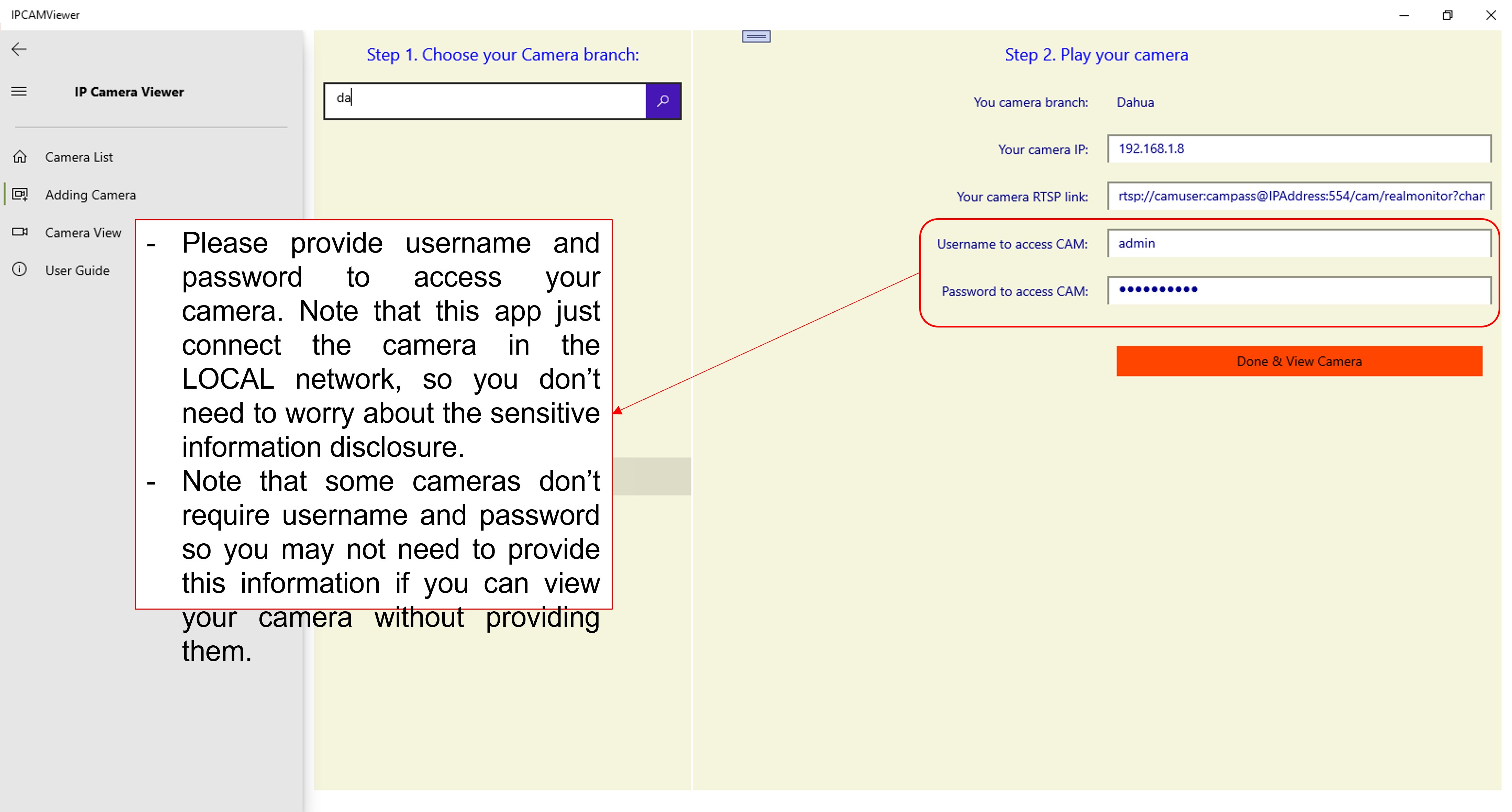 The app allows quick connection of the IPCam to the PC with minimal configuration steps.
