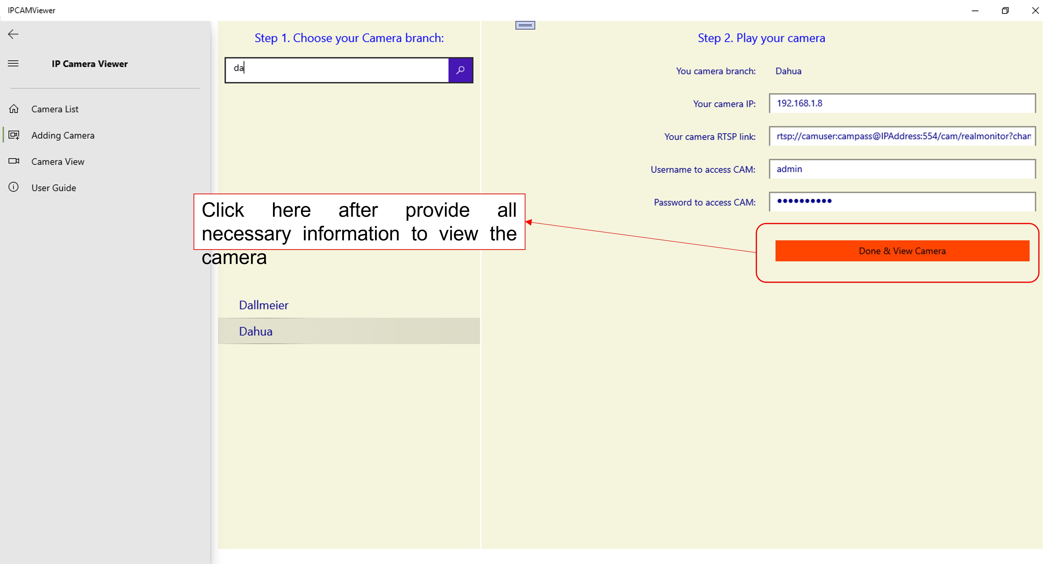 Open the app, go to ‘Add Camera,' select or enter your camera's details, then click ‘Start Live View' to watch streaming video.