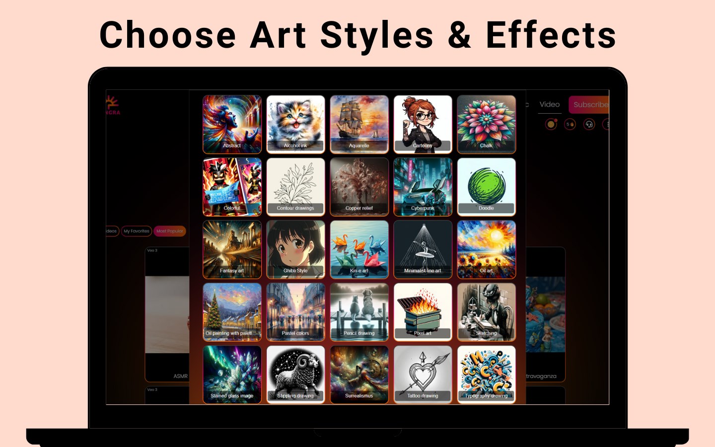 Upload your visuals or input AI prompts describing your idea. Use preset effects or custom styles to customize your video in the creation interface.