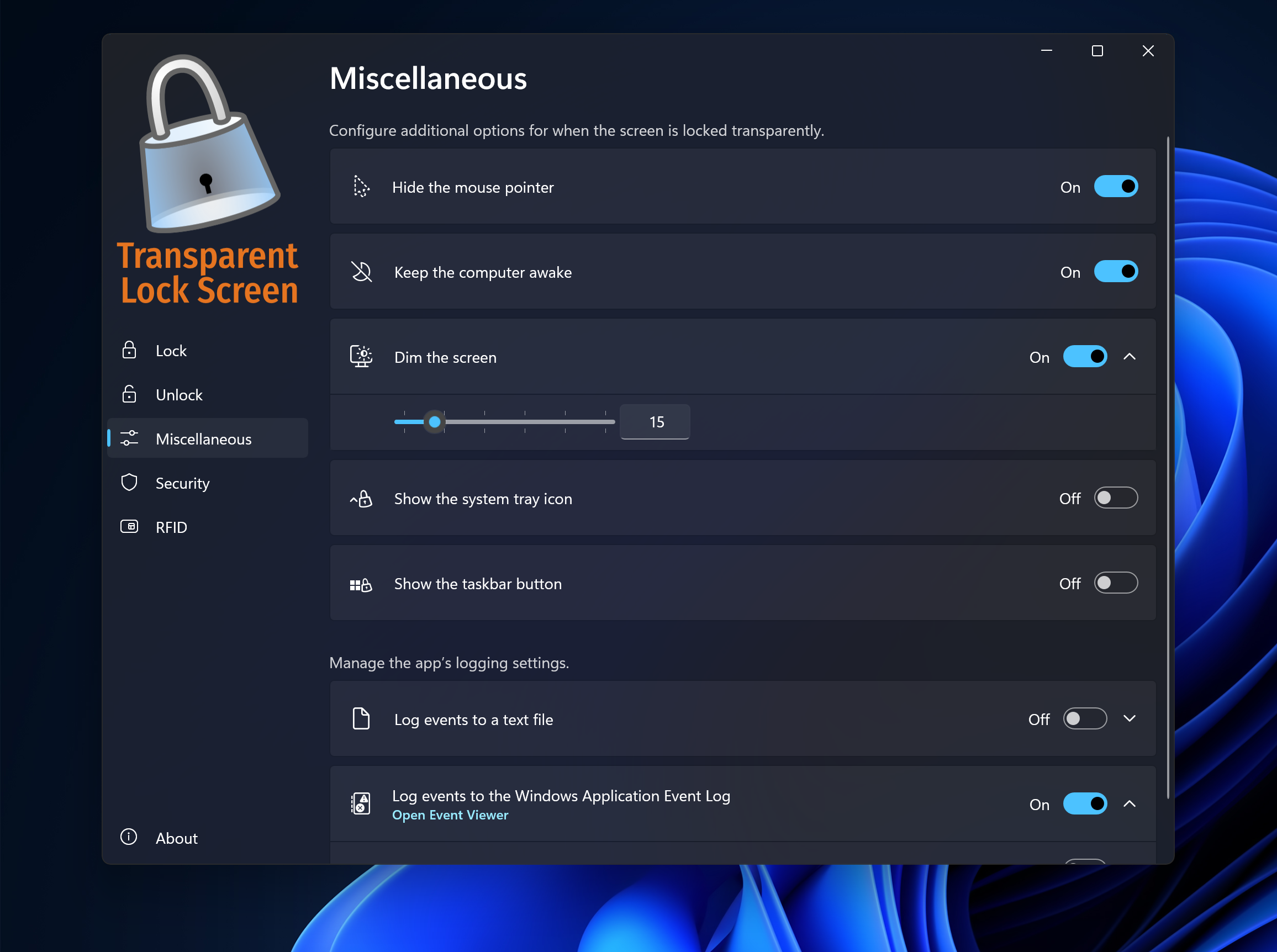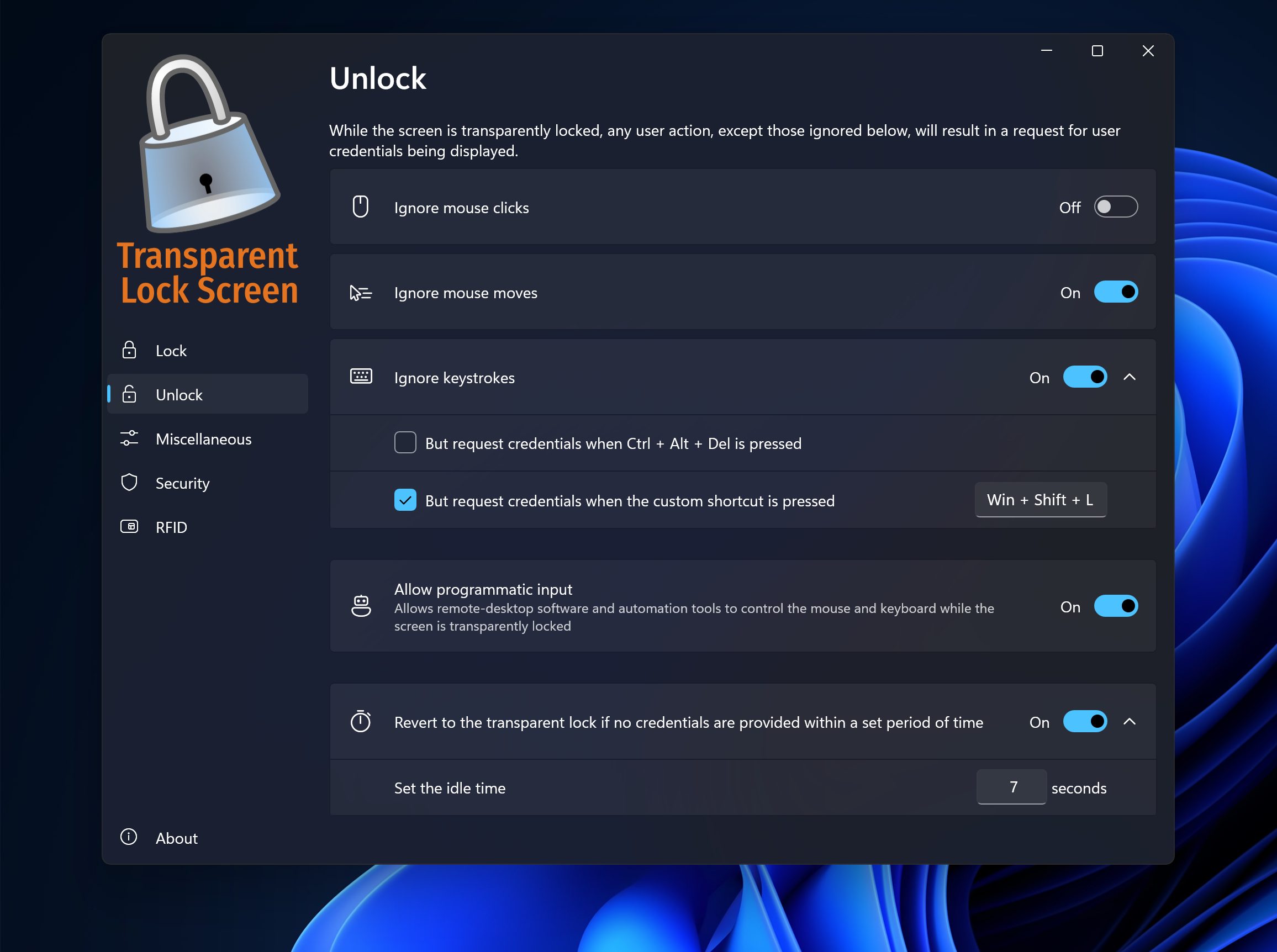 It securely locks your desktop while allowing transparency, auto-locks on idle, customizable shortcuts, and dimming options for better focus.
